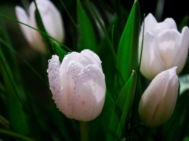 » Обои Белые тюльпаны в каплях розы