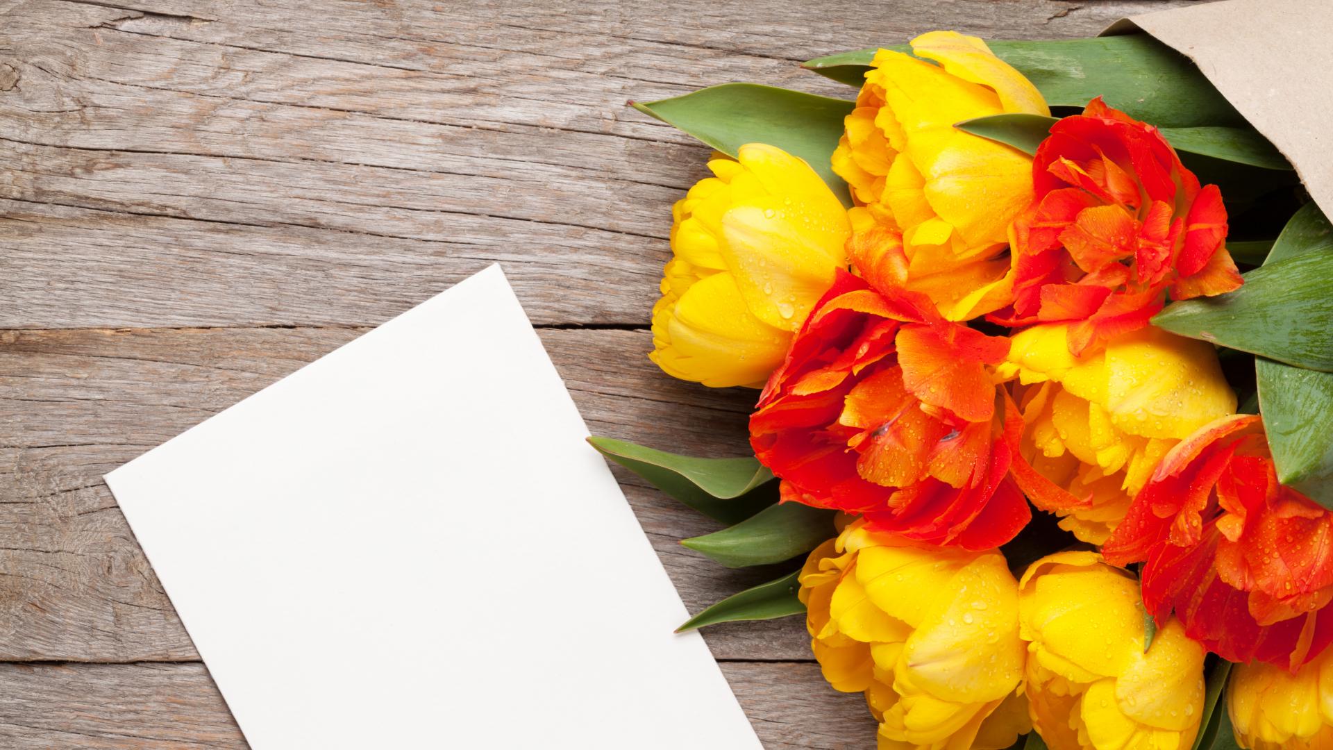 Обои Букет желтых тюльпанов на столе с листом бумаги