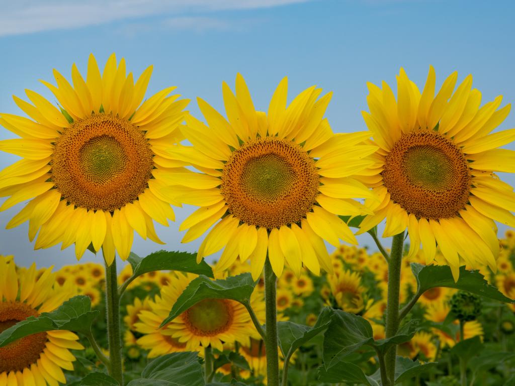 Обои Три желтых цветущих подсолнуха под голубым небом крупным планом