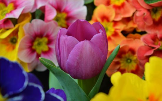 Обои Цветок розового тюльпана среди цветок примулы