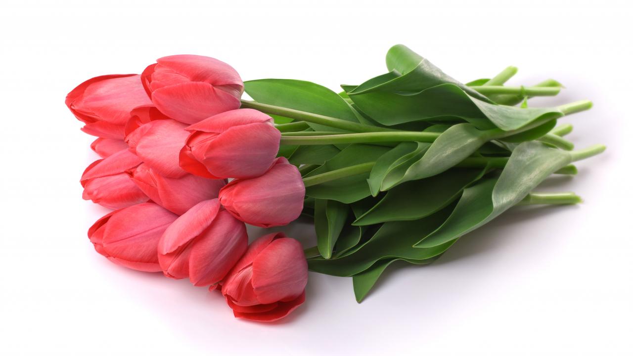 Обои Букет красных тюльпанов лежит на белом фоне