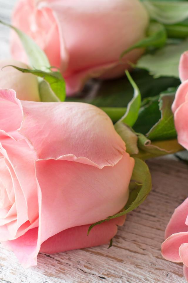 Обои Пять красивых розовых роз лежат на деревянном столе
