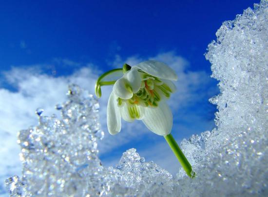 Обои Первый весенний подснежник под снегом на фоне голубого неба