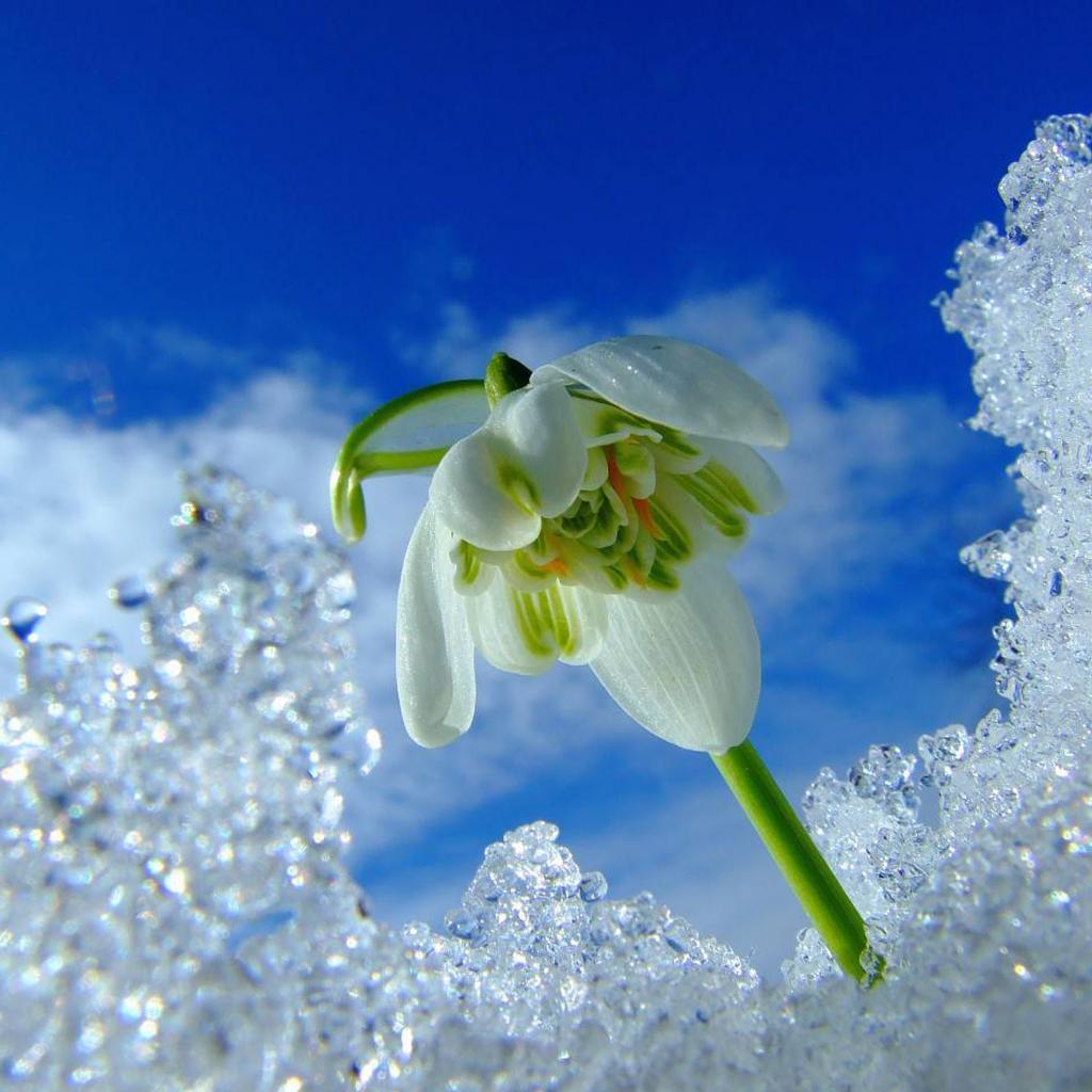 Обои Первый весенний подснежник под снегом на фоне голубого неба
