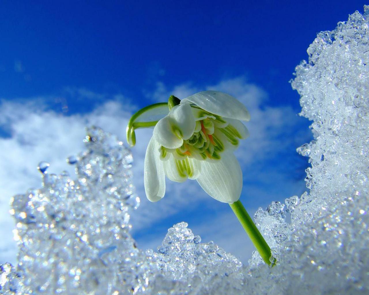 Обои Первый весенний подснежник под снегом на фоне голубого неба