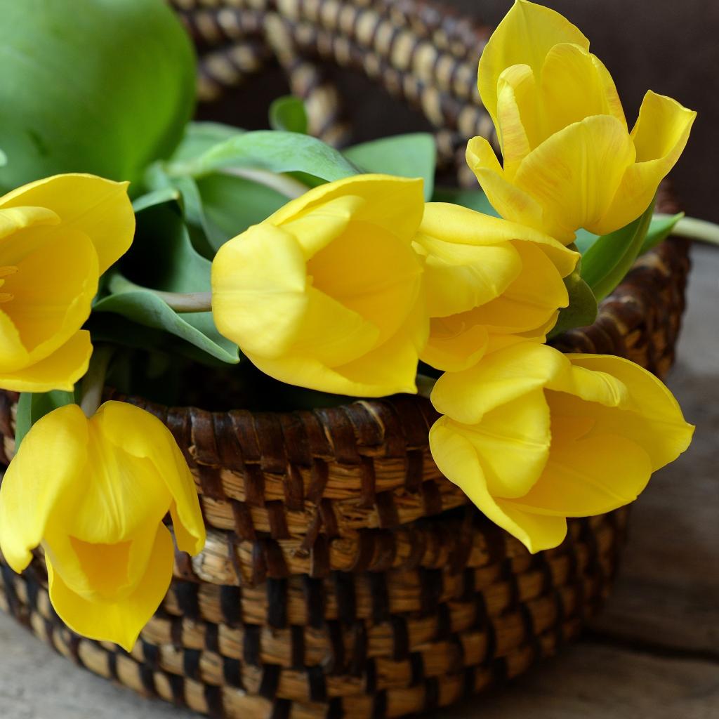 Обои Букет желтых тюльпанов в корзине на столе