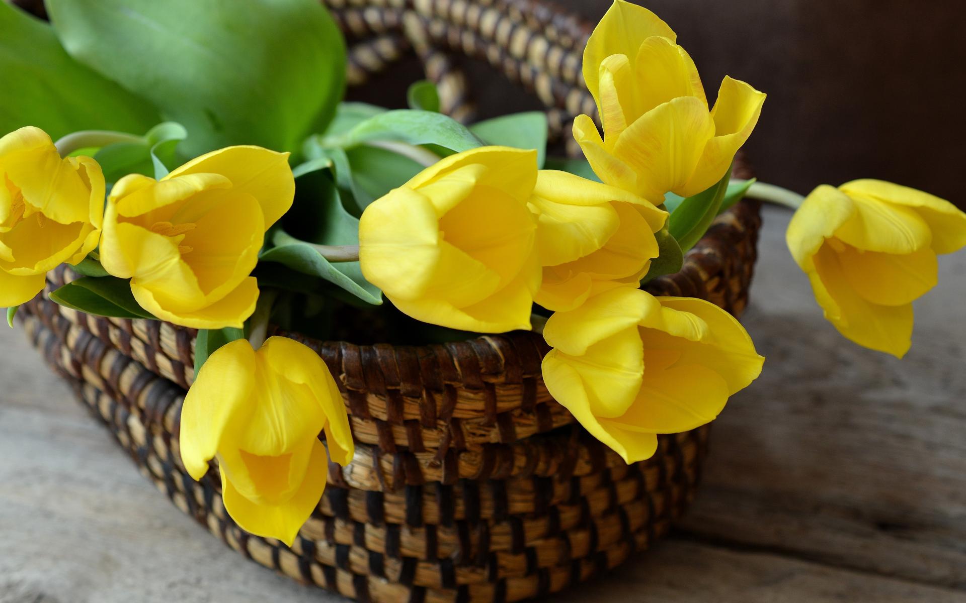 Обои Букет желтых тюльпанов в корзине на столе