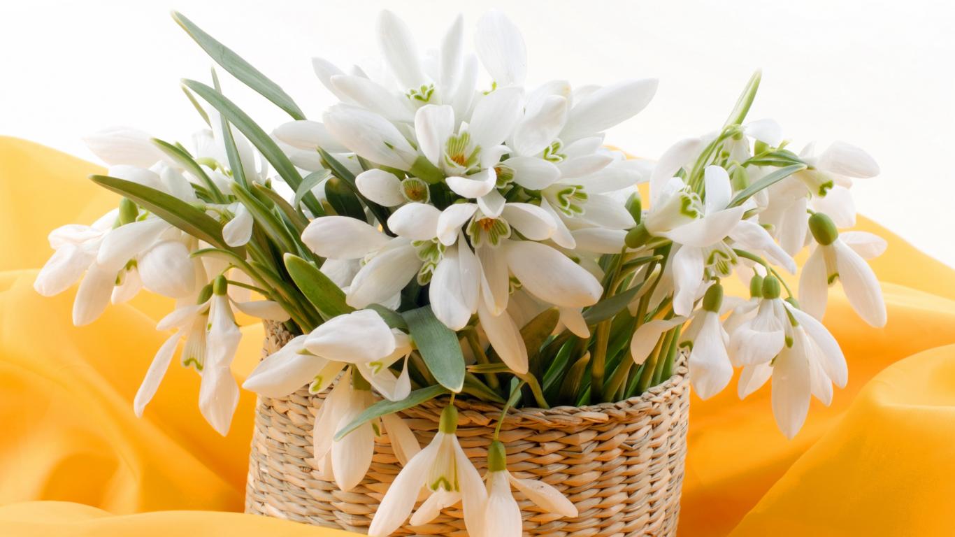 Обои Букет нежных белых весенних подснежников в корзине