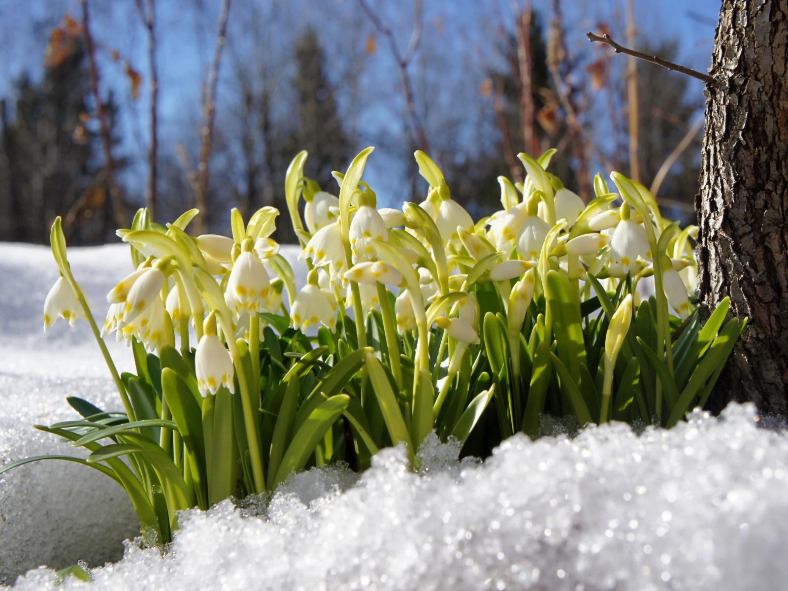 Обои Первые весенние подснежники в заснеженном лесу