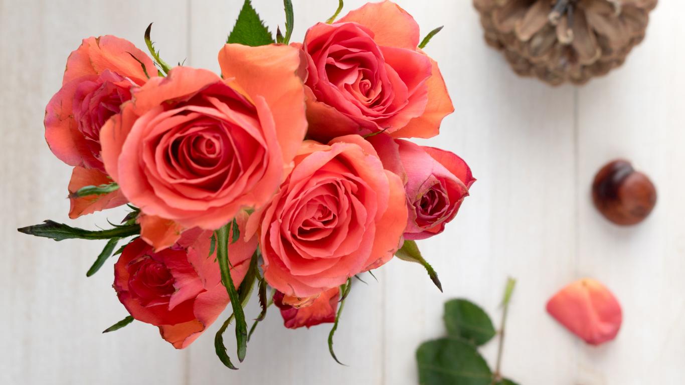 » Обои Букет розовых роз на столе с каштанами и шишкой