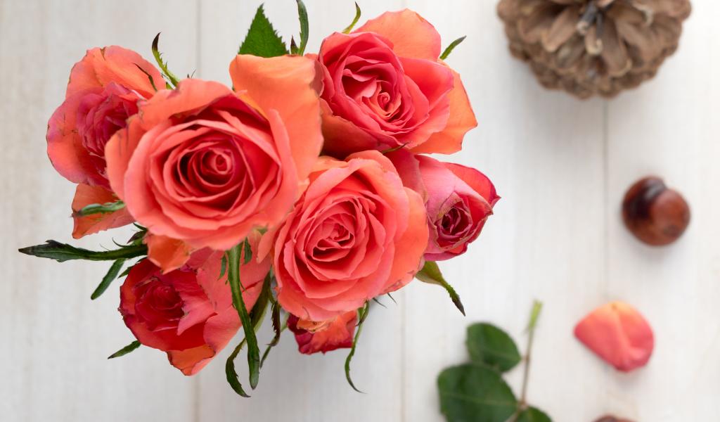 » Обои Букет розовых роз на столе с каштанами и шишкой