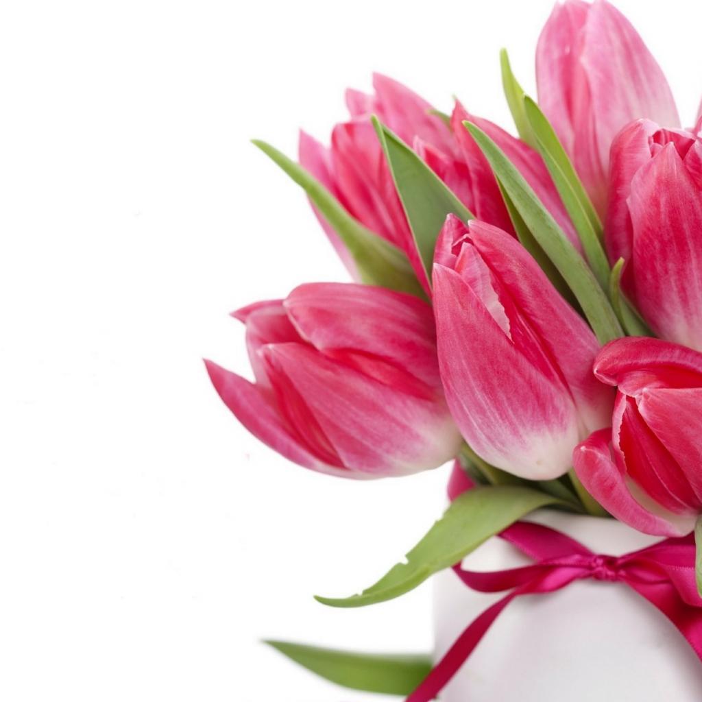 Обои Букет розовых тюльпанов с лентой на белом фоне