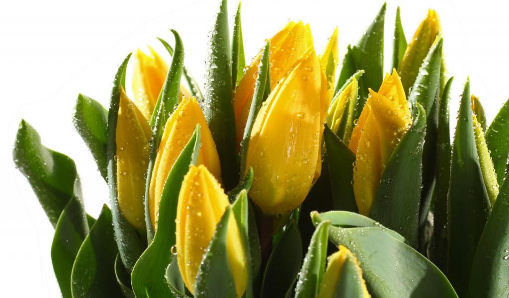 Обои Желтые мокрые тюльпаны с зелеными листьями на белом фоне