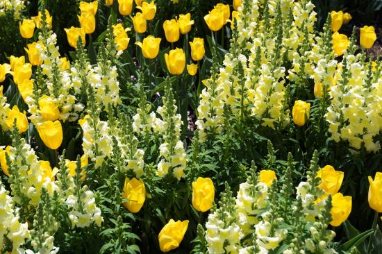 Обои Красивые желтые цветы львиный зев и тюльпаны на клумбе