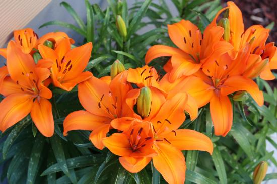 Обои Красивые оранжевые лилии с бутонами на клумбе