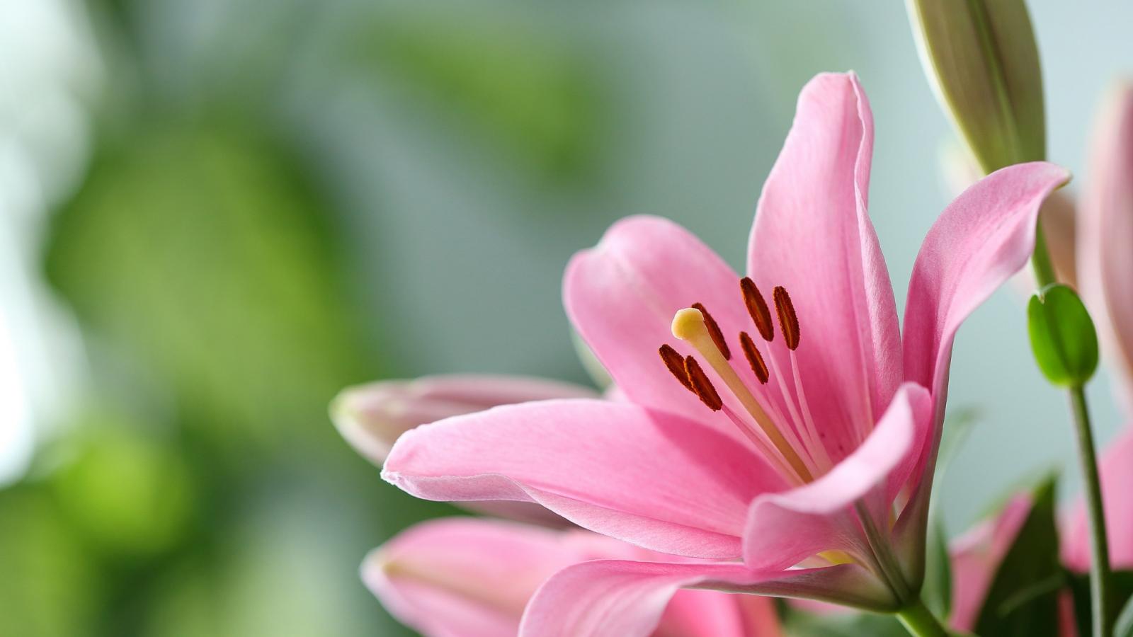 Обои Нежная розовая лилия с бутонами на зеленом фоне крупным планом