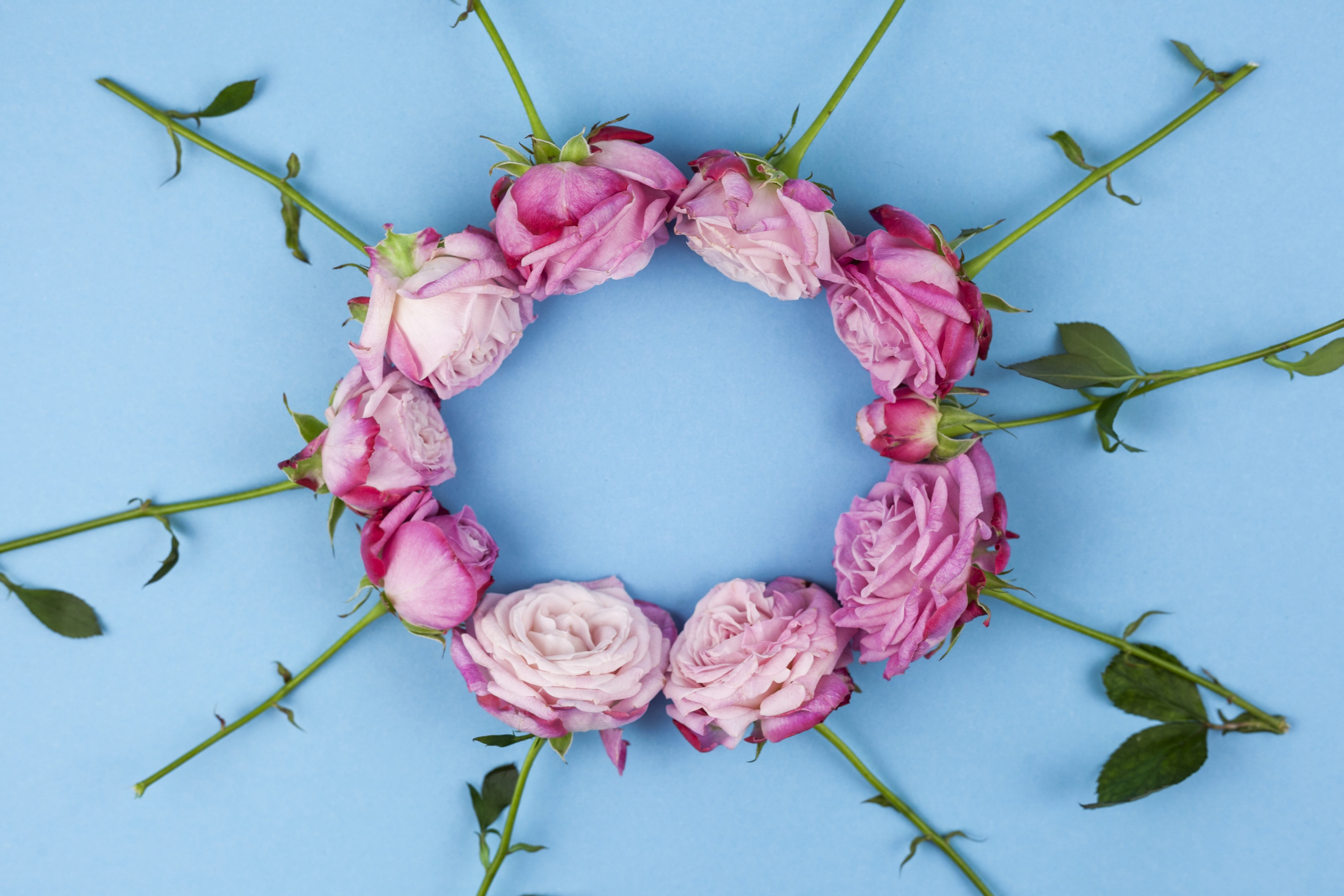 Обои Круг из розовых роз на голубом фоне