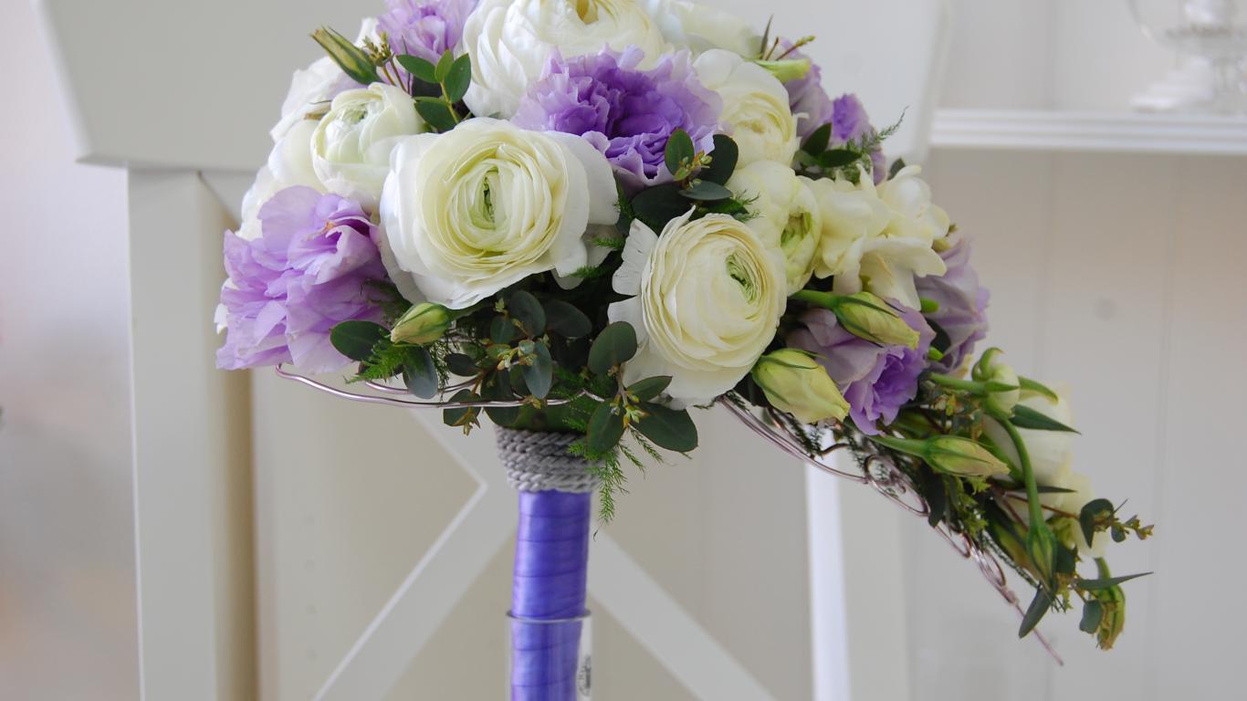Обои Белые лютики и цветы фиолетовой эустомы в букете