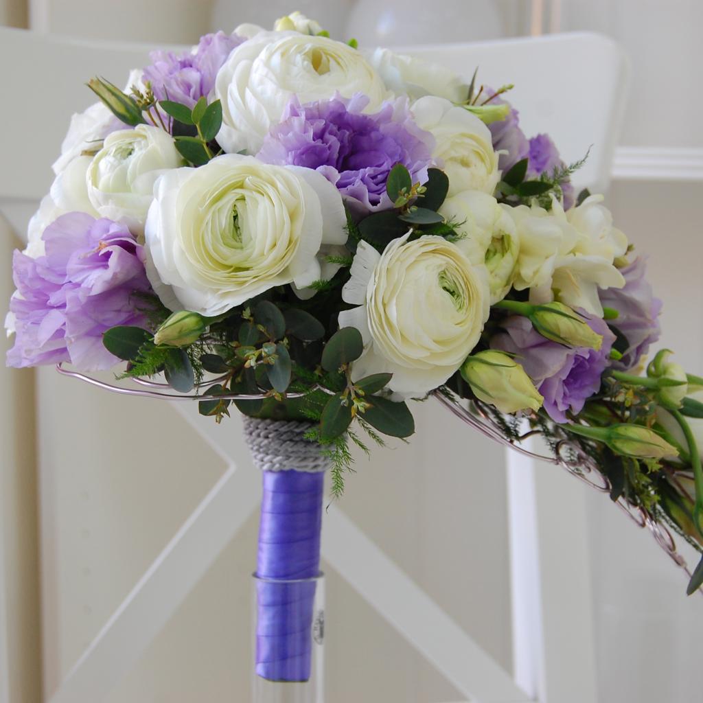 Обои Белые лютики и цветы фиолетовой эустомы в букете