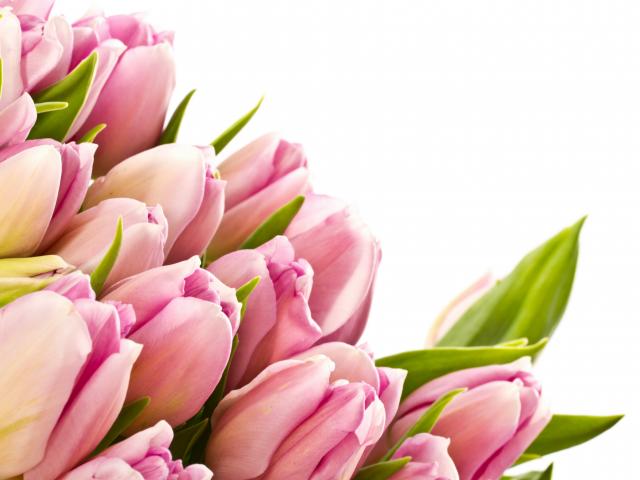 Обои Розовые тюльпаны с зелеными листьями на белом фоне