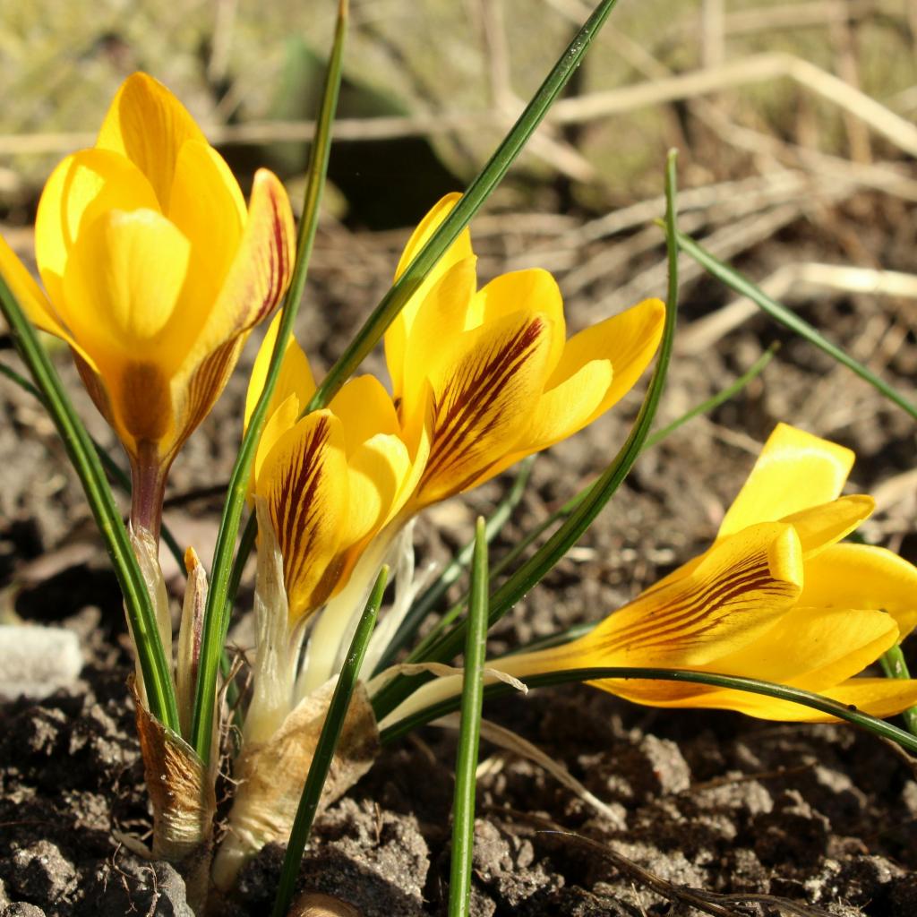 Обои Солнечные желтые крокусы на земле весной