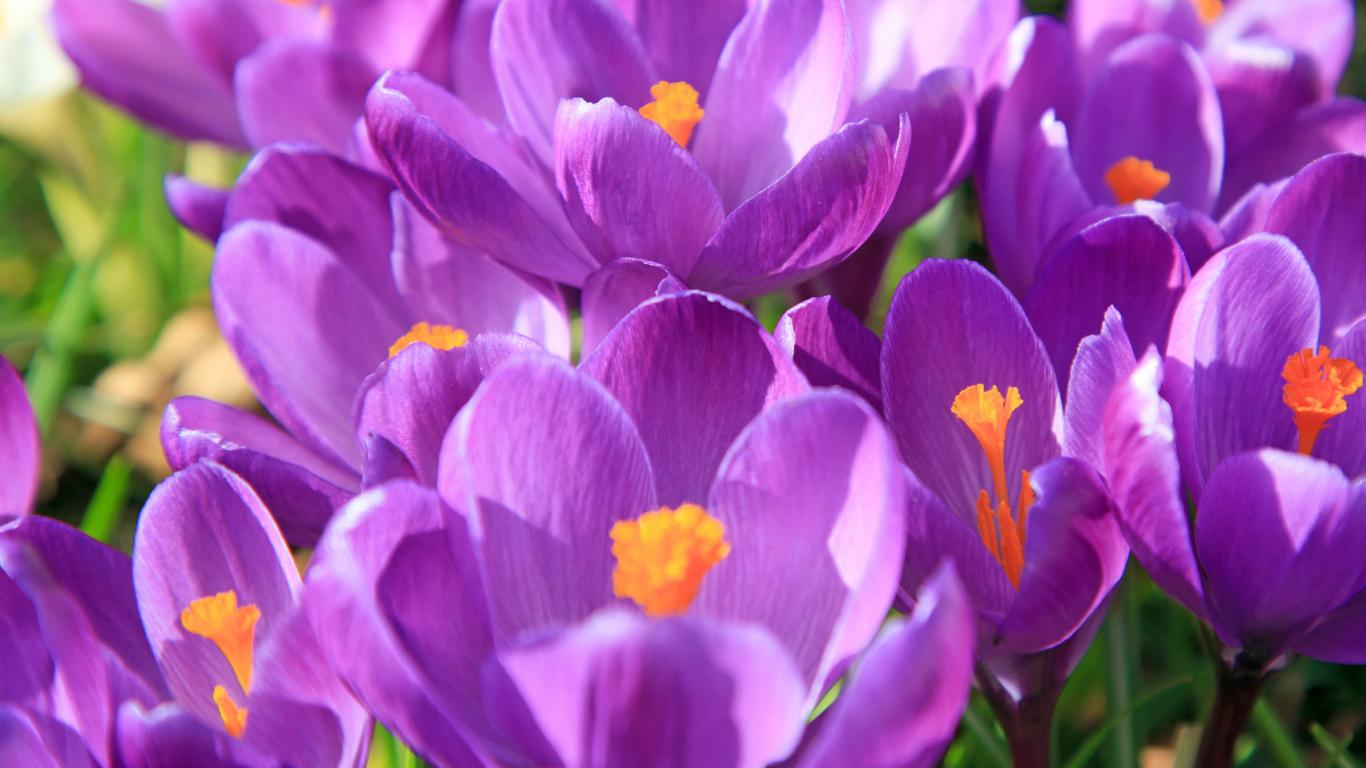 Обои Фиолетовые крокусы в лучах солнца крупным планом