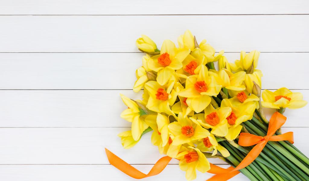 Обои Букет желтых нарциссов с бантом на сером фоне