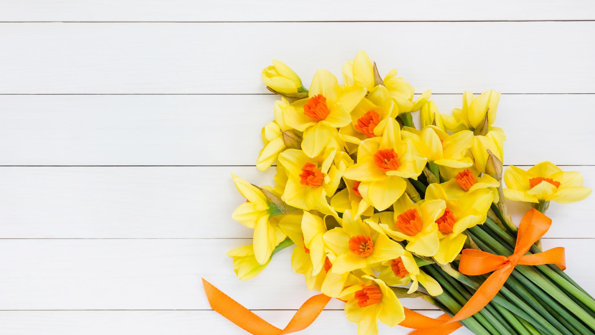 Обои Букет желтых нарциссов с бантом на сером фоне