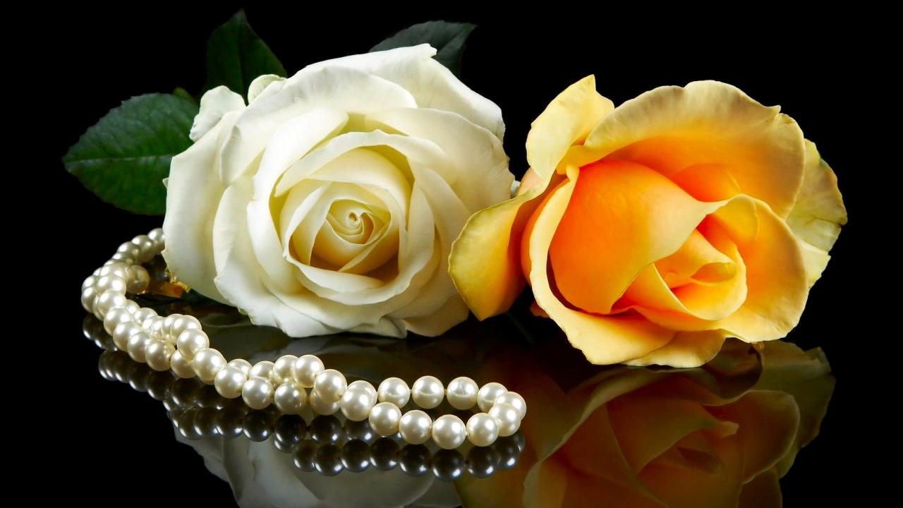 Обои Розовая и желтая роза на черном фоне с бусами из жемчуга