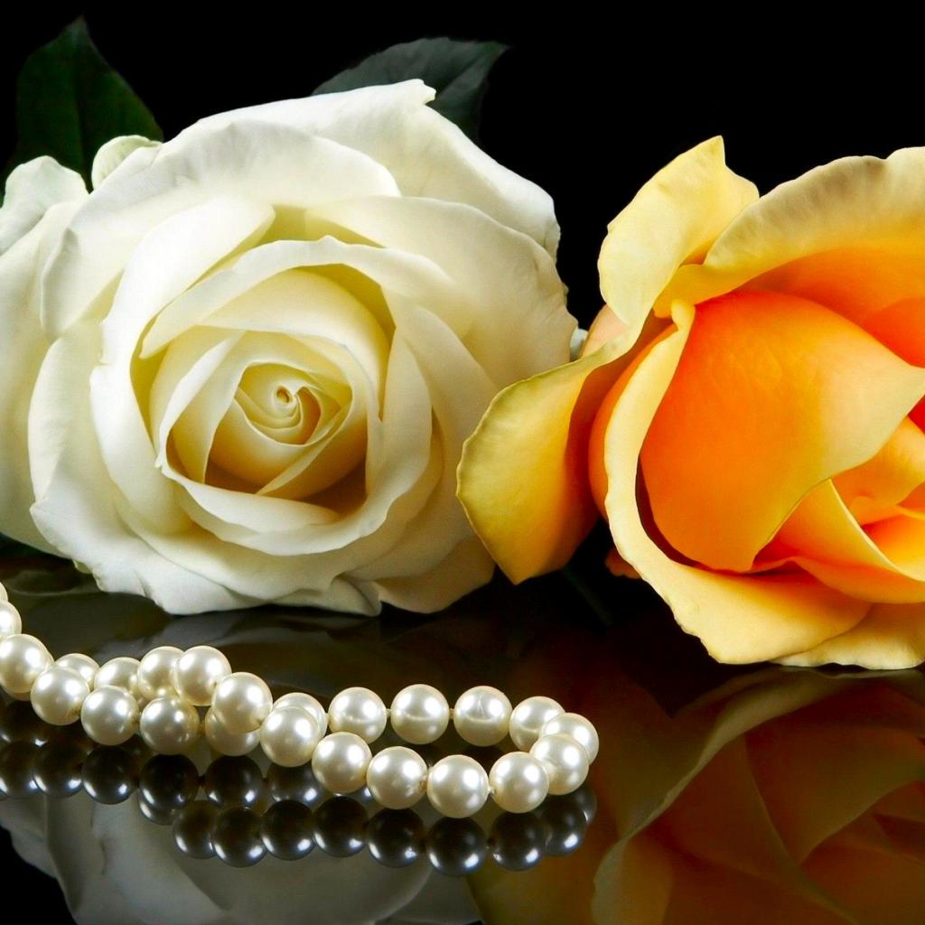 Обои Розовая и желтая роза на черном фоне с бусами из жемчуга