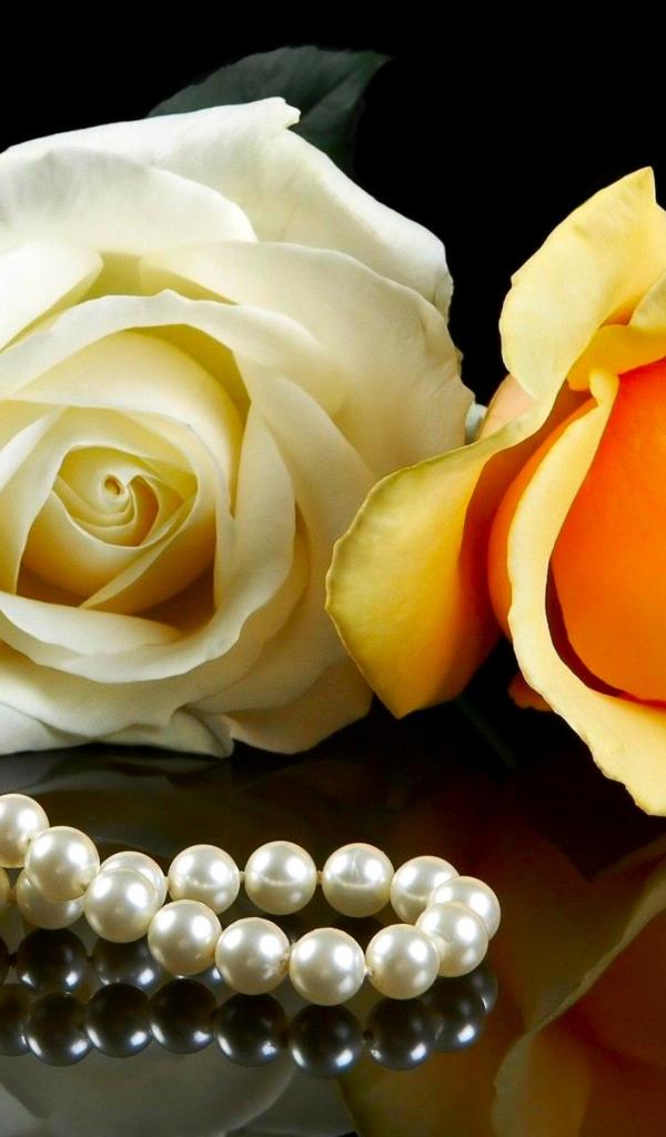Обои Розовая и желтая роза на черном фоне с бусами из жемчуга