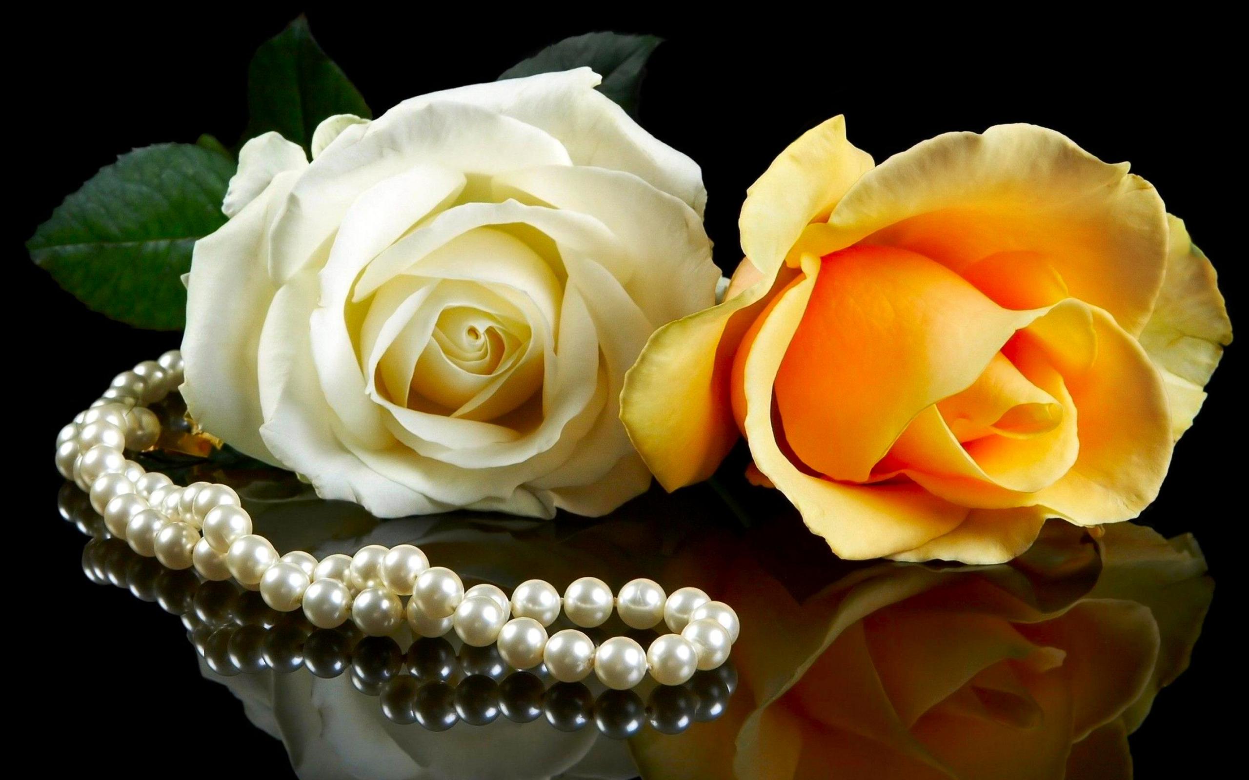 Обои Розовая и желтая роза на черном фоне с бусами из жемчуга