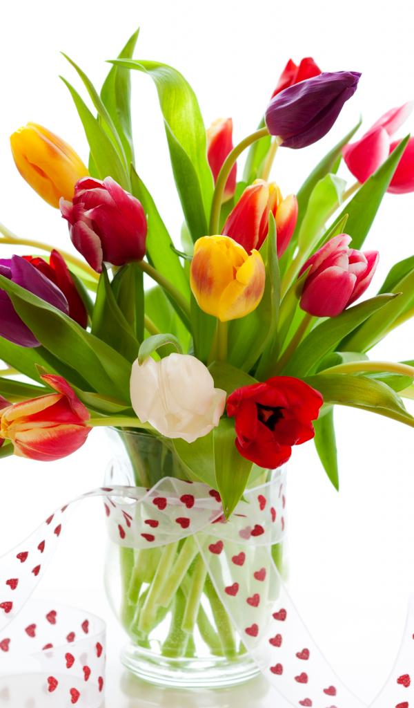 » Обои Букет разноцветных тюльпанов в прозрачной вазе с лентой