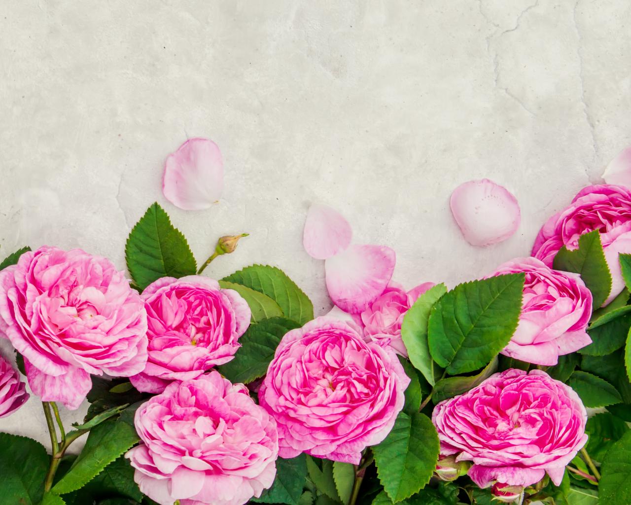 Обои Розовые розы с лепестками на сером фоне