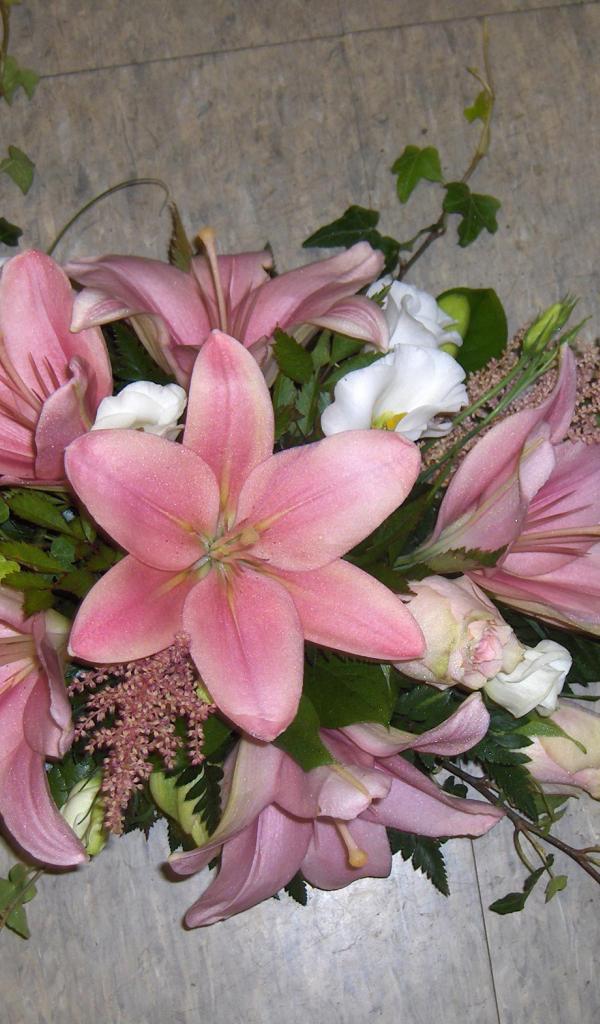 Обои Букет розовых лилий с розами на полу
