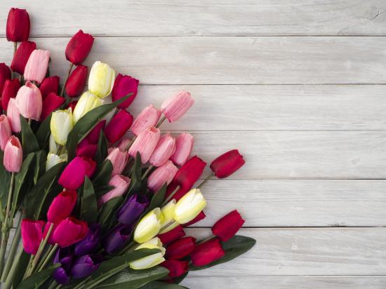 Обои Букет искусственных тюльпанов на серой деревянной поверхности