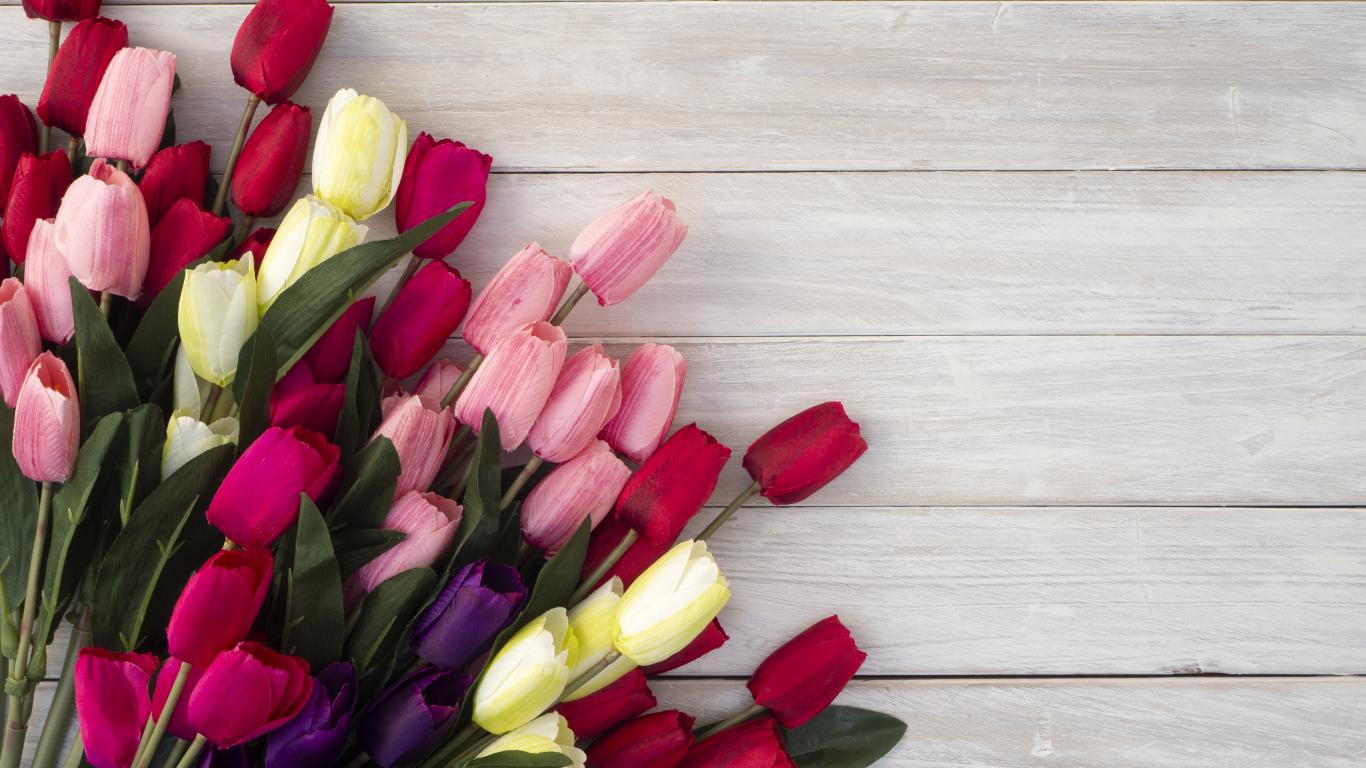 Обои Букет искусственных тюльпанов на серой деревянной поверхности