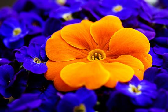 Обои Большой оранжевый цветок примулы среди голубых