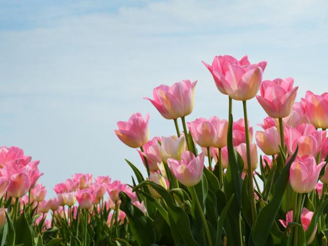 Обои Нежные розовые тюльпаны на фоне голубого неба
