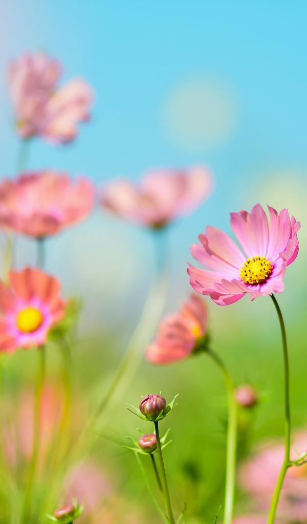 Обои Розовые цветы космея под голубым небом летом