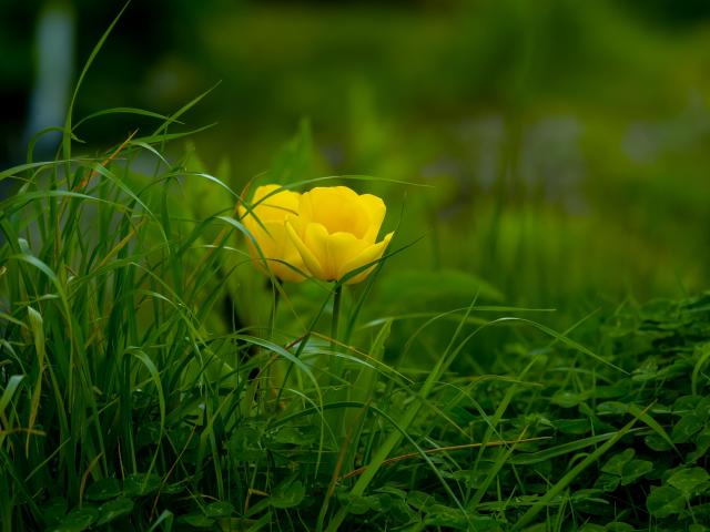 Обои Два желтых тюльпана в зеленой траве