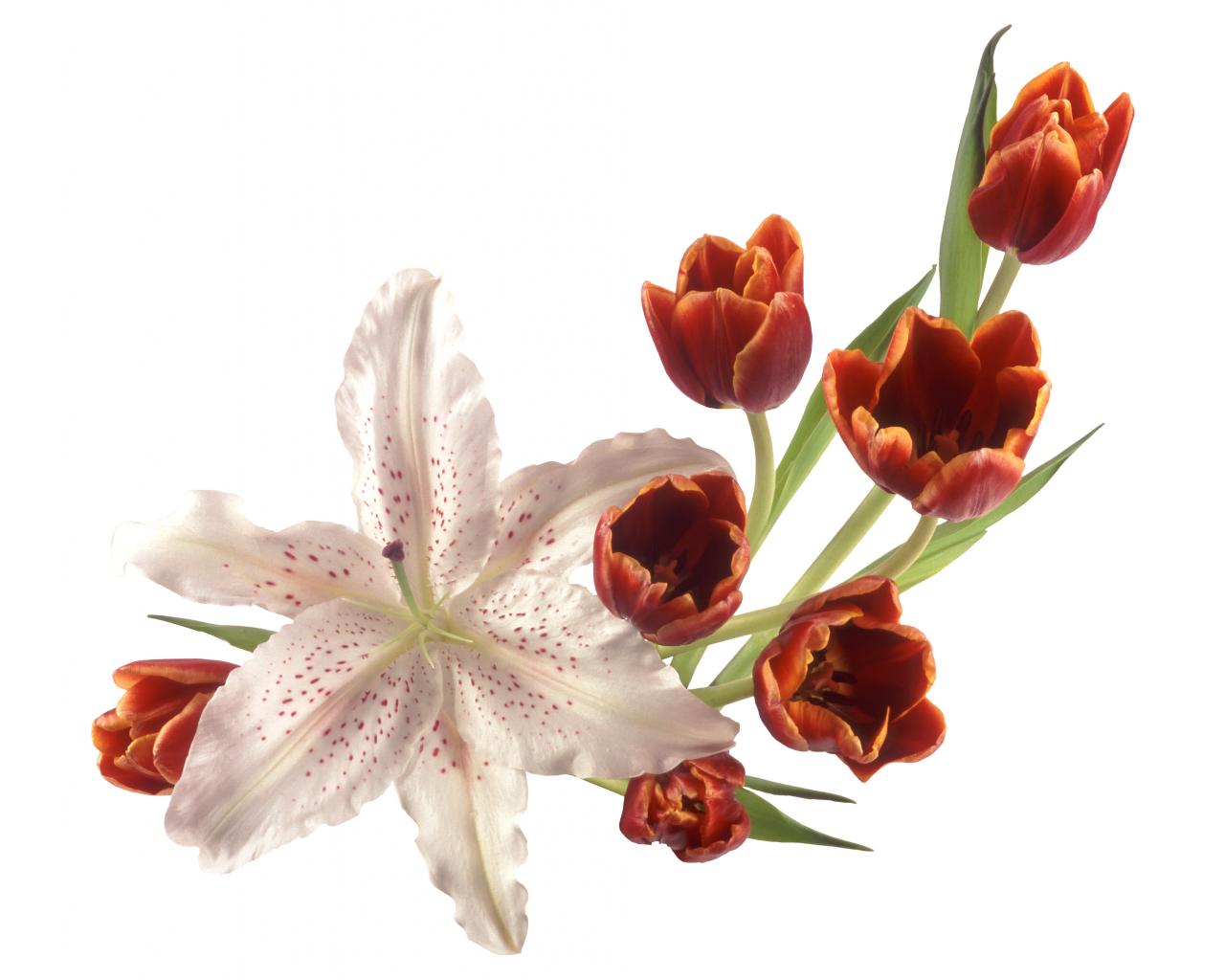 Обои Оранжевые тюльпаны с лилией на белом фоне