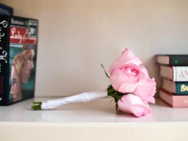 Обои Букет розовых роз лежит на полке с книгами