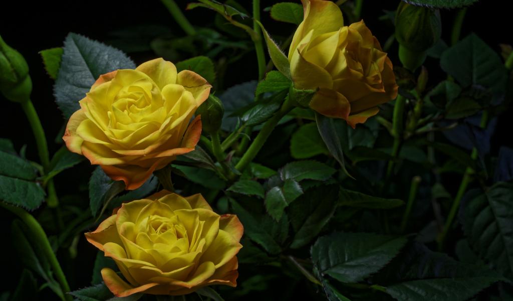 Обои Три желтые розы с зелеными листьями на черном фоне