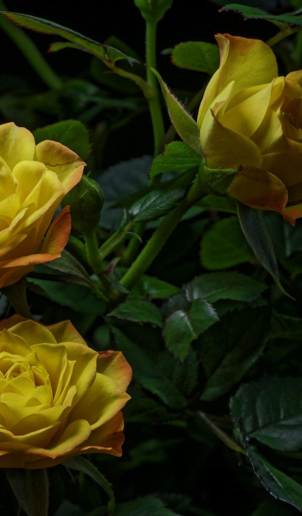 Обои Три желтые розы с зелеными листьями на черном фоне