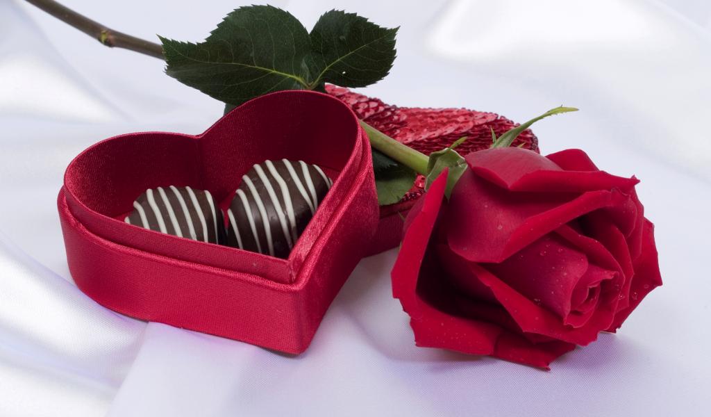 Обои Красная роза с коробкой с шоколадными конфетами в форме сердца