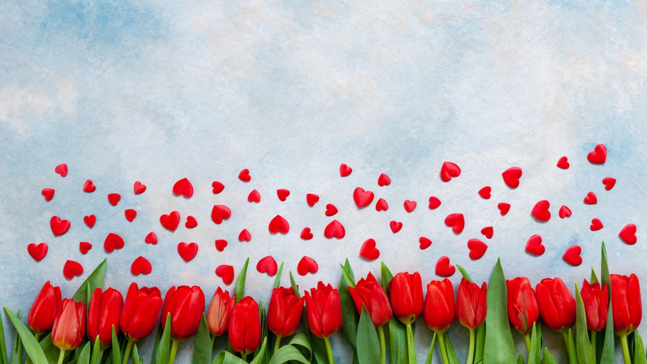 Обои Красные тюльпаны на голубом фоне с красными сердечками