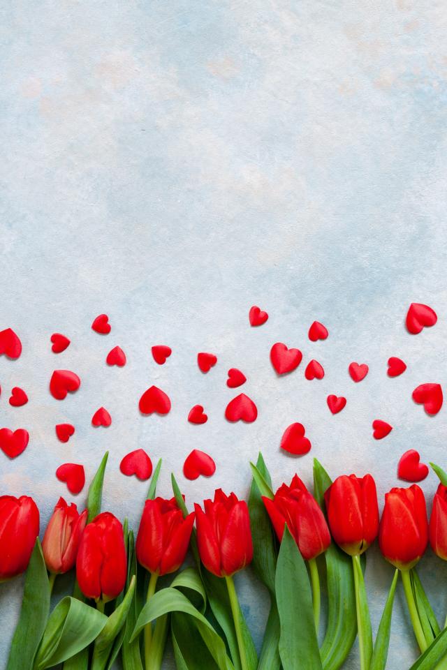 Обои Красные тюльпаны на голубом фоне с красными сердечками
