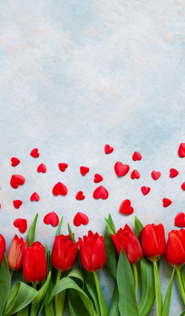 Обои Красные тюльпаны на голубом фоне с красными сердечками