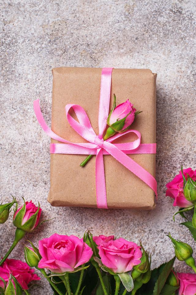 Обои Подарок на сером фоне с букетом розовых роз